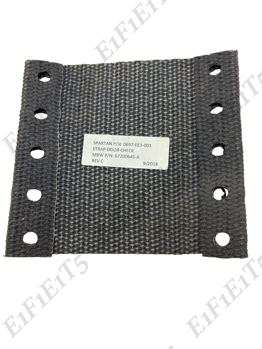 Here we have a Door Check Strap by Spartan (0697-EE3-001), designed for use on Spartan emergency and specialty vehicles. This heavy-duty strap helps prevent doors from overextending, protecting hinges and adjacent body components from damage caused by excessive swing or wind force. Constructed from high-strength, wear-resistant materials, this OEM-quality component ensures long-term durability and consistent performance in demanding field conditions. It offers a secure, factory-fit replacement for worn or damaged door check straps, restoring proper function and safety.