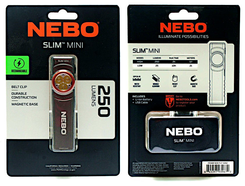 What’s Included: NEBO Slim mini with internal rechargeable battery and magnetic base, pocket clip, USB-C cable